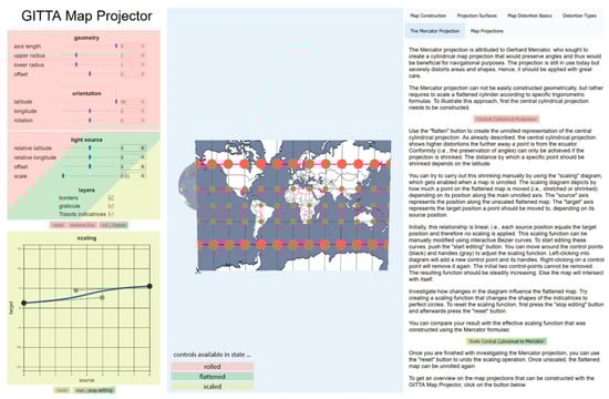 The proposed visualization concept was implemented in a prototypical educational tool to allow unguided and guided exploration of the map construction process in a comprehensive and interactive manner. Its central 3D view shows the arrangement of the required objects: the projection surface, the light source, and the globe. Figure 6 shows the prototype in the final “scaled” state. This state was constructed by first creating the central cylindrical projection in the “rolled” state, then unrolling the surface to obtain the “flattened” state, and finally by manually scaling the flattened surface to approximate the Mercator projection, representing the “scaled” state.