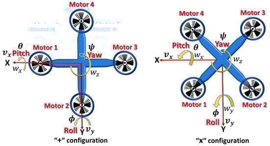 The drone utilized in this work is quadcopter drone, which is composed of four brushless dc motors that control the drone motions, according to their speeds. Typically, the quadcopter employs one of two configurations, either plus or X configuration (X configuration is used in this work), as shown in Figure 4.