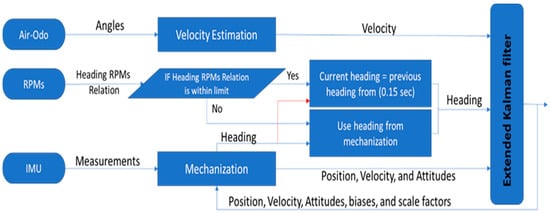 The prediction step is followed by an update step as shown in Equations (21)–(23), to interpret the data from the aiding sensors when it’s available, e.g., GNSS, Air-Odo (velocity), and heading (VDM).