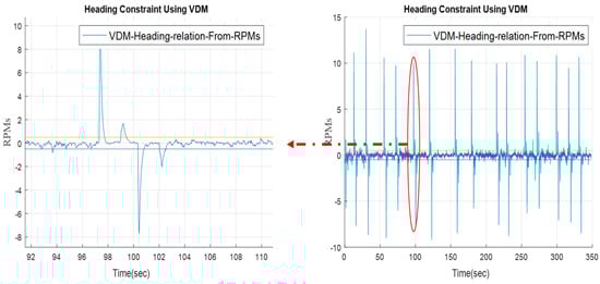 The overall workflow of the sensor integration is shown in Figure 5. The workflow composed of two parts; first, the quadcopter velocity estimation which is achieved with the aid of Air-Odo. To estimate the velocity of the quadcopter, Air-Odo measurements (angles) pass through a least-square method, during Global Navigation Satellite Systems (GNSS) signal availability, to calculate the constant in Equation (7). As there are unmodeled parameters such as friction at point O, which are not taken into consideration, this constant is used to calculate the velocity of the quadcopter with the aid of Equation (6). The second part is quadcopter heading estimation with the aid of VDM. As shown in Equation (11), the yaw movement is achieved when there is a change in the RPMs of motors 1 and 3, opposite to the change of motor 2 and 4 RPMs. The output of this motor relation is compared against the experimental threshold as shown in Figure 6. If the result is within the threshold bound then the previous heading value is used as an update to KF (as in this case the VDM indicates that there is no change in heading), while if the result of the yaw VDM relation is greater than this threshold (this means that VDM indicates that there is a change in the heading angle), the heading from the mechanization is considered as an update to the KF.