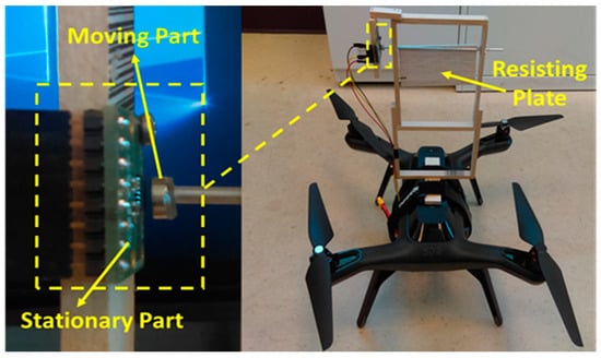 The motion of the quadcopter will cause airflow opposite to the direction of motion, and this airflow will cause the resisting plate to deviate from its initial position, as shown in Figure 2, due to the drag force imposed over the resisting plate from the airflow. According to the resisting plate deviation angle, the velocity of the quadcopter can be estimated. However, the relation between the drone velocity and the measured angle is not a 1:1 relation, but it can be derived according to the mathematical model shown in Equations (2)–(7).