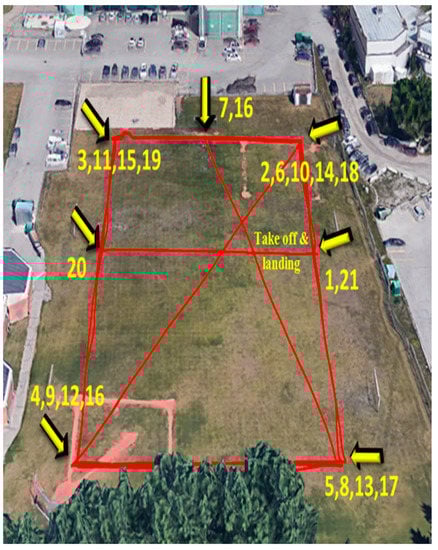 This autonomus flight is composed of 21 waypoints as shown in Figure 10, with different velocities varying between 3 and 5 m/s for a total time of 350 s.