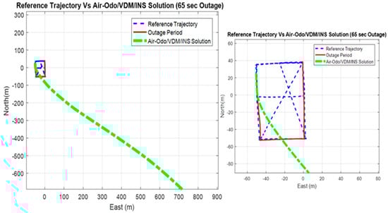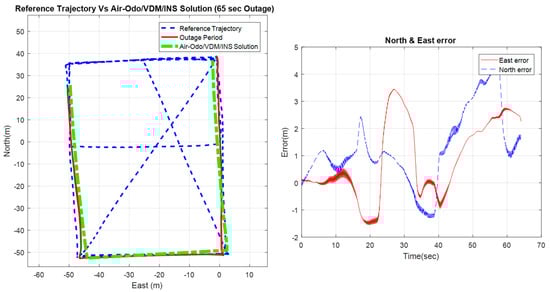 Figure 13 and Table 1 show the performance of the proposed approach (Air-Odo /INS integration) without the VDM heading update during an artificial GNSS signal loss of 65 s.