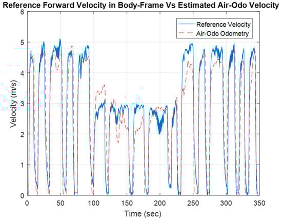 The previous figure showed that Air-Odo was able to estimate the velocity of the UAV with RMSE of ~0.6 m/s. Also, the figure shows that there are differences between the reference velocity and the estimated velocity in some parts resulting from the existence of wind gust.