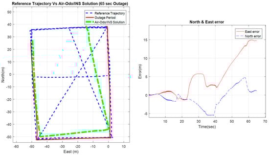 Air-Odo/INS integration performance during 65 s of complete GNSS signal outage.