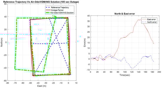 Figure 17, shows the performance of the UAV navigation system based on Air-Odo and VDM, for a 185 s GNSS signal outage period. The figure shows the effectiveness of the proposed approach to bound the drift of the INS system, also Table 4 shows the performance of the proposed system as an aiding system.