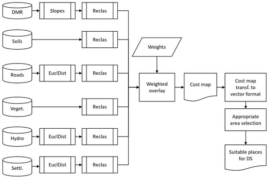 First of all, it was necessary to understand the factors that influence the complete solution of the problem and form these structures into a clear structure. With the individual factors, it was necessary to choose evaluation criteria and set their weights. In this case, the choice of a suitable place was influenced by factors of terrain elevation, its soil surface, communication conditions, vegetation cover, hydrological conditions, resident areas, and area of DS [31,32]. Even though water sources are also evaluated in terms of their abundance within SOP, this evaluation was not considered in the model example due to complicated access to relevant data. That is why this factor was not included in the analysis.
