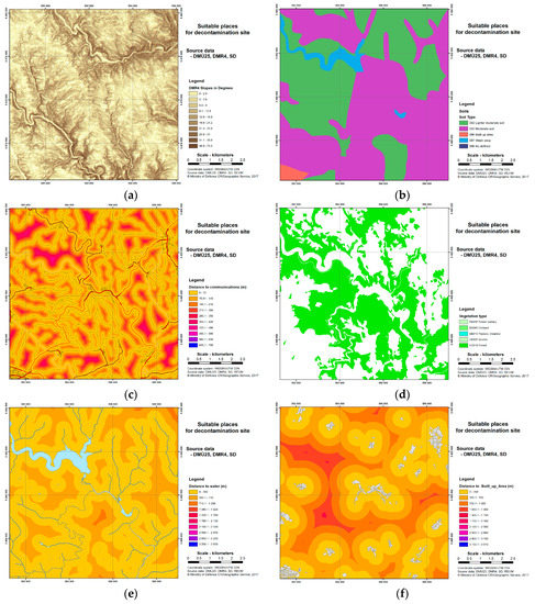 (a) Cutout of a raster layer of inclination of slopes analyzed from the raster digital elevation model (DMR4). (b) Cutout of a raster layer of soil types. (c) Cutout of a raster layer of Euclidean distance to communications. (d) Cutout of a raster layer of vegetation types. (e) Cutout of a raster layer of Euclidean distance to waters. (f) Cutout of a raster layer of Euclidean distance to built-up area.