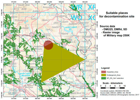A geographical problem is to select suitable places in the given locality outside the impacted and endangered area where it would be possible to place the mentioned decontamination site so that in the given area this facility was functional and the terrain configuration would not restrict it or restrict it in an acceptable way [27,28,29,30]. The following text provides a description of the procedure when solving this model example.
