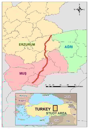 Study area; Muş natural gas pipeline project (MP) covering Erzurum, Ağrı and Muş provinces.