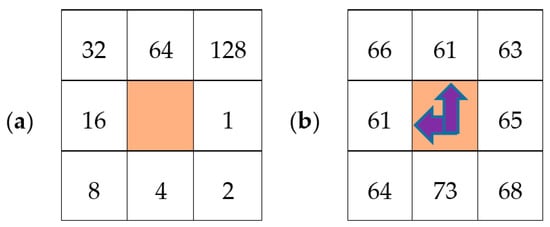 Flow direction []. (a) Steepest drop direction chart; (b) for example, on the right side, the steepest drop is 61 and its direction values are 16 and 64; therefore, the center pixel has the 16 + 63 = 80 value.