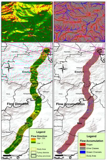 Ridges are one of the most important natural formations of the natural gas pipeline route. Since these areas have no accumulation of water, especially due to the slope, this situation provides some advantages. The first of which is that these areas are generally far away from agricultural areas, and this is an important factor in deciding on the pipeline path. Another advantage is that the ridges are not affected by erosion, and therefore the pipeline soil is not shifted to another location. The last advantage of these areas is that when compared to other natural formations, the accumulation of water are at a minimum level after the risk of flow and sediment accumulation. In contrast to ridges, streams are one of the worst elements that have an effect on the selection of the pipeline route selection since, like rivers and brooks, they can cross over perpendicularly. There are special precautions, such as precast concrete armor or horizontal drilling; however, in practice, pipeline projects do not follow streams because water erosion risk is at a maximum level at these points. Therefore, pipelines must be kept underground in a very rugged situation. The basic characteristic feature of ridges and streams are related with water accumulation. There is no water accumulation in ridges, but in contrast, streams can be possible drainage channels of water. On the GIS platforms, water accumulation is calculated with the flow direction and flow accumulation functions.