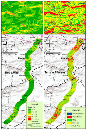 The aim of this type of study is to ascertain all the criteria and possible risks in order to realize the route that is most suitable and has the least environmental cost in terms of the land use []. There are two options to realize this goal. The first option is to determine a number of possible alternative routes with a starting and ending point in a certain region and evaluating the routes using all the necessary criteria and then to select the most suitable route. For the second option, the study is performed on a route that was previously determined by conventional methods and constructed in the field [,,]. This new study can be undertaken using today’s technologies, which provides the opportunity to use all the criteria to compare the two routes and their alternatives while the route is actively running, and all the predetermined criteria can be observed in the field. In this paper, the authors focused on the second option. To be able to distinguish this study from other work, topographic classifications, such as ridges, flat terrain, steep terrain, and water channels of the study field were specifically taken into consideration and classified using various GIS-based analyses. Thus, this process provided the opportunity to investigate on a continuous surface, rather than a discrete one. In addition, a line-based simplification process with the point removal algorithm was applied and evaluated in relation to the generated route for construction issues.