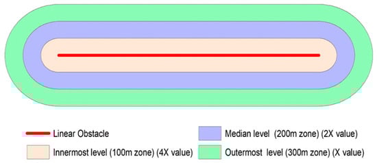 Another type of obstacle is vertically crossed obstacles. These objects are generally in the line-based geometry, which is laid down through all the working corridors. Therefore, it is almost impossible to design a route without taking these hurdles into consideration. In the project site, there will be high voltage power lines, and due to an interference effect, natural gas pipeline routes can be damaged by corrosion. To minimize this, power pipelines should pass through vertically using special precautions. The other obstacle is that it is not recommended for pipelines to pass over these fault lines. Although there are some regulations for these situations, in some cases it is obligatory to pass over these fault lines. Highways are one of the other obstacles that only allow vertical crossing and forbids parallelization between roads and pipelines within 50 m. The last obstacles for this project are agricultural irrigation water channels, which can be under the surface or on the surface. For this obstruction, vertical crosses are defined in LCPA with generating ring buffers. Considering the vertical resolution of the DEM data, in this project 100, 200, and 300-m buffer zones were created around obstacles under this category. The innermost level cost was two times higher than the middle-level buffer zone and the outermost level two times lower than middle level (Figure 7).