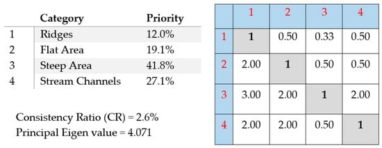 In the first place, scoring was undertaken for topography class. The scoring matrix and pairwise weight table are shown in Figure 9.