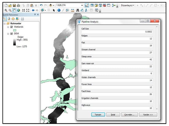 Today’s technologies use skillful software and hardware performance to solve complex engineering problems that have many factors and use large amounts of data. The pipeline route selection with multi criteria is an important and complicated engineering problem []. In addition, during the project stage, many problems can be faced. To overcome and facilitate the solution to all these problems, GIS has been used in many Multi-Criteria Decision Making (MCDM) analyses to obtain an accurate and quick result with its powerful and effective tools. MCDM has been used in many scientific works [,,,,]. Today the MCDM process is performed with different techniques, such as elimination and choice expressing reality (ELECTRE), analytic hierarchy process (AHP), and the technique for order preference by similarity to ideal solution (TOPSIS). [,]. In this study, the AHP technique was used to evaluate the criteria. In general, all criteria can be evaluated with GIS capabilities and intensive geometric and attribute data management are easy to manage with geospatial database management. It is obvious that GIS is sufficiently capable to determine all types of route design [].
