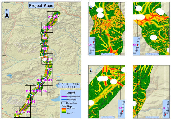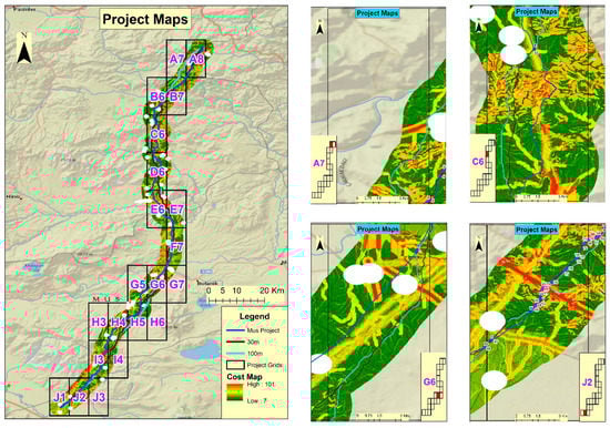LCPA analysis was run for two different DEM values, 30 m and 100 m, to obtain the DEM effect on pipeline routing. As a result, a base map, also referred to as a “cost map”, was generated in a GIS environment with different scales in a map book display (Figure 12).
