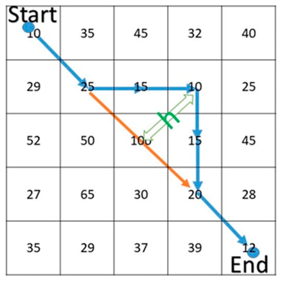 To overcome the problem of the number of vertex points, a line-based cartographic simplification (LBCS) process was applied to the suggested route using 30 m raster DEM [,]. Before applying LBCS, the reason for high vertex points was investigated. For a route design from the start point to the end point with LCDA (Figure 13), the cost will be 107 (10+25+15+10+15+20+12) and the route will have three vertex points. However, for the optimum route, the cost will be 167 (10+25+100+20+12) with no vertex points. In the simplifying process, for each vertex, “h” values are calculated, and if this value is greater than 100 m, then that point is removed from the route. The expectation from the simplification process is that it increases the cost and decreases the total length.