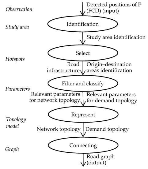 The procedure is organized in the following steps: Observation (Input); Study area (Identification); Hotspots (Select); Parameters (Filter and Classify); Topology model (Represent); Graph (Output).