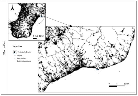 During the observation step, the whole detected positions of P (input data), were visualized on a geo-referenced map, with the aim of providing a preliminary idea of potential study area. Figure 3 shows the detected positions, P, inside the whole Province of Reggio Calabria (small map in the top-left of the figure) and in the area near the port (main map of the figure) during the period of analysis of 4 weeks. The detected positions, that are also origins and destinations of the trips, are represented with specific labels (see the map key). The portions of the area where there is the highest concentration of detected positions (black spots) are mainly present along the coast, where are located the main urban centres.