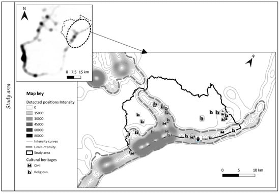 On the base of input data of the previous step, the influence areas of detected points P were calculated assuming a circular shape with constant radius ra = 3 km (Figure 4, small map in the top-left of the figure) and with a linear decay function. The small map shows the different values of intensity for each geographical point using different greys from white (intensity = 0) to black (intensity > 8 × 104). Afterwards, the iso-intensity curves were extracted to identify homogeneous areas, characterized by the same intensity values (main map of the figure). Figure 4 also shows the result of the application of the three criteria to identify the study area (see Section 3.3.2): (a) the value of limit intensity equal to 3000, (b) the areas with the highest concentration of cultural assets and (c) the administrative boundaries. The main map shows the iso-intensity curves with continues thin grey line, the limit intensity curves with dashed grey line, the boundary of the study area with continues black line.
