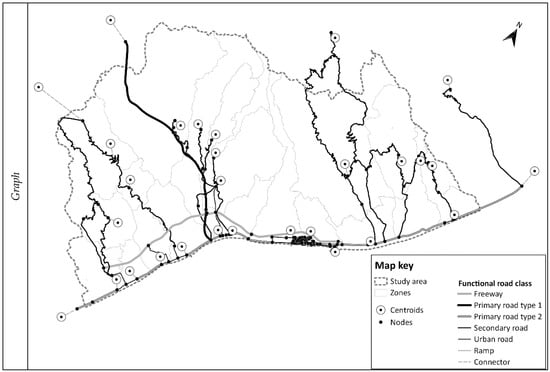 By connecting the elements identified by the topological model (previous step), as a result, the graph, the zones, the centroids, and the relative connectors are obtained. Figure 8 shows the results of the procedure related both to the supply, with the representation of nodes and of functional classes of links, and to the travel demand, with the representation of the zones and of the centroids. The study area consists of 23 zones, the road graph associated with is composed of 165 nodes and 210 road links, with a total length of 319 km.