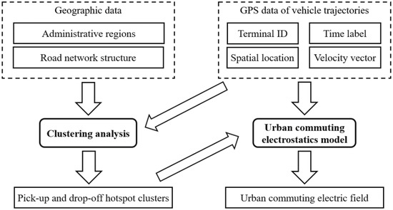 The methodology used in this study is consisted by two parts, as shown in Figure 1. First, a clustering analysis was conducted using geographic data and GPS data of vehicle trajectories to profile the pick-up and drop-off hotspot clusters. The practical meaning of hotspot clusters is the areas/zones with concentrated pick-up or drop-off events in a city during a specific period of time. Second, an urban commuting electric field was built based on the urban commuting electrostatics model, using GPS data of vehicle trajectories and the distribution of hotspot clusters. The key connection between the clustering analysis and the urban commuting electrostatics model is the pick-up and drop-off hotspot clusters. The hotspot clusters are the output of the first method and are simultaneously the input for the second model.