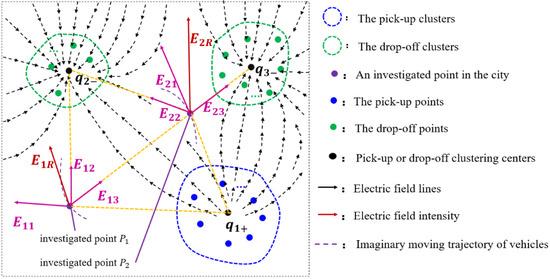 Suppose that there are pick-up and drop-off hotspot clusters and road points. The urban commuting electric field can be calculated by Equation (14):