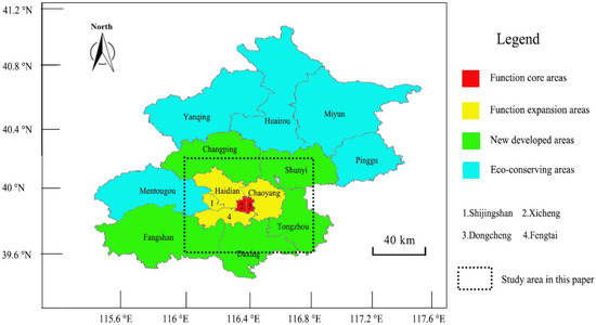 Beijing occupies an area of 16,410 km2 and hosts 21.73 million people, giving a population density of 1145 people/km2 [38]. Beijing covers 16 administrative regions (Yanqing, Huairou, Miyun, Changping, Shunyi, Pinggu, Mentougou, Haidian, Chaoyang, Shijingshan, Xicheng, Dongcheng, Fengtai, Fangshan, Daxing, and Tongzhou). There is a total of four functional areas: core areas, expansion areas, new developed areas, and eco-conserving areas. As the traffic hotspots are mainly concentrated in the center of Beijing, we chose an area in this location as the study area. The study area is an approximate rectangle spanning 116 to 116.8° E and 39.6 to 40.2° N, and has an area of 4552.99 km2. Figure 3 shows a map of Beijing which has been divided into districts according to administrative regions and functional areas [39].
