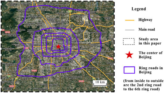 Road traffic plays a critical role in connecting most people’s homes with their places of work or study. In Beijing, by June 2016, there were 21,885 km of public road, of which 982 km were highway. Figure 4 shows the road network of the study area. This figure shows only the highways, including the ring roads, and main roads, as they are the most important components of all the public roads, and typically enable the function of urban road-traffic commuting in a city. While some minor roads and paths may be chosen by pedestrians or cyclists, they do not play important roles in people’s long-distance commuting in a city, since these minor roads and paths mainly exist in communities, Hutongs (a type of narrow street or alley commonly associated with northern Chinese cities, especially Beijing), parks, etc.