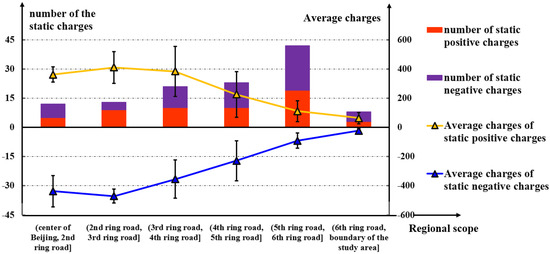 There is a total of 56 static positive charges and 63 static negative charges in the study area, as shown in Figure 5. Traditionally, Chang’an Avenue, in front of Tiananmen Square, is considered to be the central point of Beijing. There are five ring roads in Beijing: the 2nd ring road to 6th ring roads. These ring roads divide the study area into six regions. The characteristics of static charges are shown in Figure 6. It was found that the number of static charges increases, with the exception of the area between the 6th ring road and the boundary of the study area, while the average charges fall when it is getting closer to the periphery of the city. This means that there are more static charges but fewer large static charges around the periphery of the city. It was found that most of the largest static charges are concentrated inside the 4th ring road. This means that the amount of commuter traffic within this region is the greatest for the same time interval. It was also found that the numbers of static positive charges and static negative charges are similar in each region, which means that job–housing balance has been a characteristic of the spatial distribution in the study area.