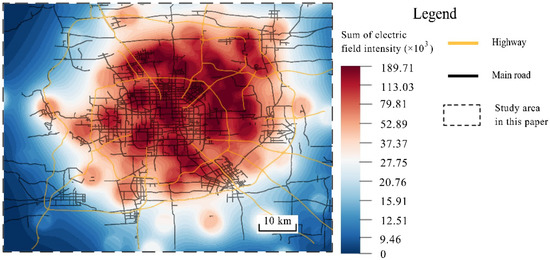 According to the assumptions made in Section 2.3, the sum of the electric field intensities at a specific road point reflects the importance of the road point to a certain extent. To prepare for later use in this study, the distribution of the sums of the electric field intensities in the study area was calculated. The result is shown in Figure 7. We found that it is easier to form a sub-circular area with a high sum of electric field intensities near the center of the study area. The sum of the electric field intensities is generally lower in the area close to the edge of the study area.