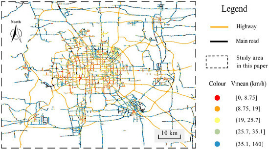 The mean velocity of vehicles is the most important index for evaluating traffic flow conditions. The mean velocity of the vehicles in each road grid was calculated. The result is shown in Figure 8. In this figure, the intervals of the average velocity are divided into five groups: [0, 8.75], (8.75, 19], (19, 25.7], (25.7, 35.1], and (35.1, 160] (km/h). The widths of the intervals are not equal, in order to ensure that the number of clustered vehicles in each group is the same. Figure 8 also shows that the traffic condition is mainly in accordance with a two-ring structure. The mean velocity of vehicles outside Beijing’s 4th ring road largely falls in the range of (25.7, 160] km/h, with the color of the road grids being mainly green and blue. The mean velocity of vehicles in the core area of Beijing is generally less than 25.7 km/h, and the color of the road grids are mainly yellow, orange, or red.