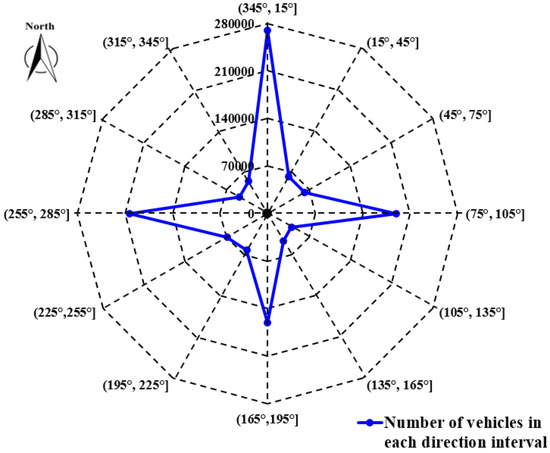The direction in which vehicles are heading is another important index for monitoring traffic flow conditions. We calculated the direction of each vehicle from 1,308,705 individual GPS data records. The result is shown in Figure 10. The numbers of vehicles heading in the direction intervals (345°, 15°], (75°, 105°], (165°, 195°], and (255°, 285°] are 269,320, 189,222, 161,221, and 203,597, respectively, accounting for 21.22%, 14.91%, 12.71%, and 16.04% of the total, respectively. These figures show that most vehicles in the study area moved in a north-south and east-west direction. This is in accordance with the road layout in the study area, since most highways and main roads in Beijing are arranged in the north-south and east-west directions.