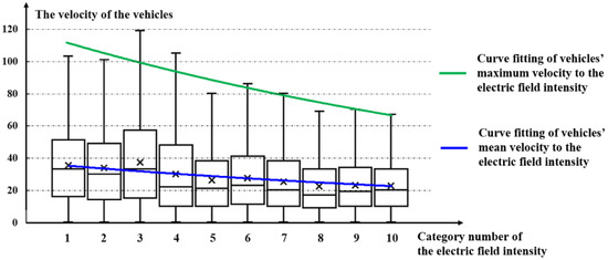 According to the first assumption made in Section 2.3, the sum of the electric field intensities at a specific road grid usually reflects the importance of the road grid to a certain extent. Some previous studies have proved that there is a physical relationship between the density of traffic and the average speed of vehicles [42]. Therefore, road grids with higher importance will be more likely to have a slow traffic condition, since the bottleneck of the road-traffic network with a high density of traffic usually exists where the centrality of the network is higher. It also follows that the maximum velocity and the mean velocity of vehicles at a road grid with higher importance will be slower. The detailed correlation between the maximum velocity and mean velocity of the vehicles and the sum of the electric field intensities is shown in Figure 12. According to the results shown in Figure 7, the sums of the electric field intensities are divided into 10 groups to ensure that the data recorders in each group are the same. The category numbers and the corresponding intervals of are as follows: ①, ②, ③, ④, ⑤, ⑥, ⑦, ⑧, ⑨, ⑩. We found that as the sum of the electric field intensities increases, both the maximum velocity and the mean velocity of vehicles have a significant tendency to decrease. This means that the areas with high electric field intensity calculated by the urban commuting electrostatics model are more likely to be slow traffic areas.