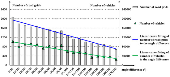 According to the second assumption made in Section 2.3, the overall direction that vehicles take tends to be the same as the direction of the electric field. To verify this assumption, we calculated the vector sum of the velocities of vehicles in each valid road grid. As is well known, the vector sum of the velocities of two vehicles traveling at the same speed but in opposite directions is zero. Thus, the vector sum of the velocities of vehicles in the road grids can offset the velocities of some vehicles traveling in the opposite direction, and can reflect the comprehensive direction of the velocities of the vehicles in those grids. The vector sum of the directions of the electric field at a road point is easy to calculate based on the urban commuting electrostatics model. The angle between the vector sum of the velocities of vehicles at the road grids and the vector sum of the directions of the electric field at that same road point is denoted by . This difference is divided into 18 groups. These intervals are identified by . We studied the detailed correlation between the number of valid road grids and the number of vehicles clustered in the road grids to . The results are shown in Figure 13. In Figure 13, .