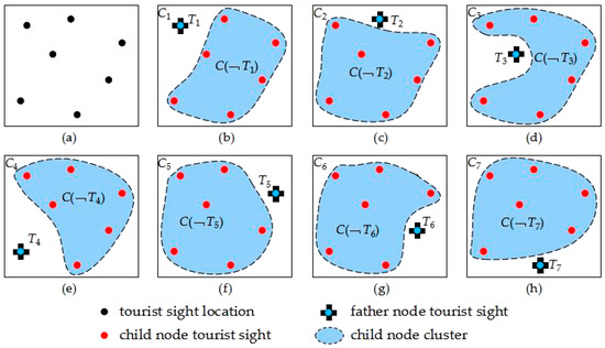 Def 4.2 Decision tree child node cluster . Tourist sight element central point is set as father node, and the other tourist sights form a cluster, which is called decision tree child node cluster [56,57,58]. Figure 4 shows all the father nodes and relative child nodes which are formed by selected tourist sight set elements. Figure 4a is tourist sight distribution. Figure 4b–h is a decision tree father node and child node cluster, , . Figure 4b shows the motive iteration decision tree formed in the way that the number one tourist sight is set as father node and the other tourist sights are set as child nodes.
