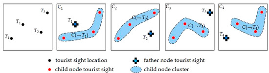 Step 2. m-central point motive iteration cluster of the number one tourist sight element is built. The number one element location tourist sight of selected tourist sight set is taken to build m-central point motive iteration cluster , which contains decision trees. Decision trees are generated by father node and child node cluster .
