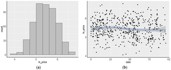 Distribution of logarithms for unit prices (a) and trend of price change over time (b).