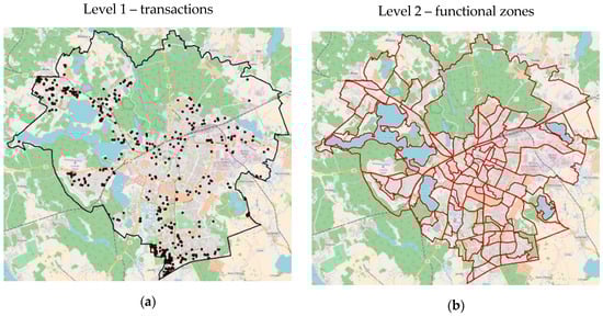 All observations assumed for analyses were grouped into two hierarchy levels. The first level refers to transactions and their attributes, while the second level concerns the location of the property in planning zones resulting from the division of the area into functional zones (Figure 2).