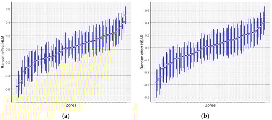 Random effects for the second level (zone) for HLM (a) and HSAR (b) models.