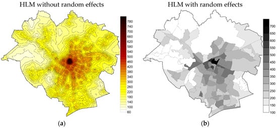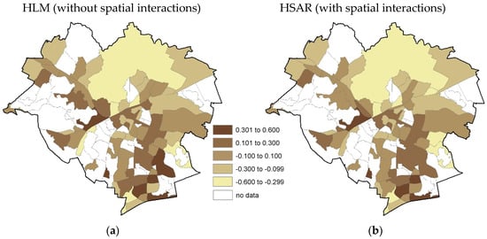 For the HLM and HSAR models, random effects for zones also have to be taken into account. Therefore, the prediction of values was carried out as the first step, based on the fixed effects of the model and the mean value was then estimated for each of the zones, taking into account random effects. For the zones with no transactions, a zero value of random effect was assumed in the HLM model, while in the HSAR model, this value was obtained through interpolation. The obtained maps are schematically presented in Figure 7 and Figure 8.