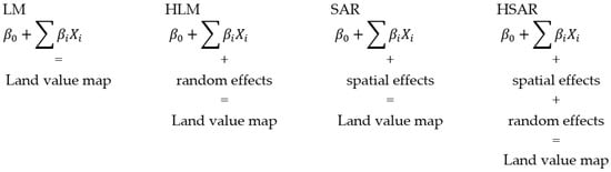 Land value maps were generated by overlaying subsequent raster layers resulting from model coefficients, interpolated component ρWy (for SAR and HSAR models), random effects (for HLM and HSAR models) and the layer constructed based on the interpolation of residuals according to the scheme presented in Figure 5.