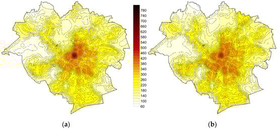 The distribution of values in both models is similar. Relatively high values prevail in the centre, decreasing when moving towards the city boundaries. Due to the fact that the developed maps are only of a demonstrative nature, water and forest areas were not excluded, although they should not be subject to the analysis.