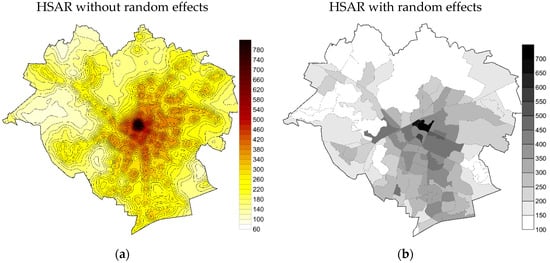 Maps of land values developed based on HSAR, (a) without random effect, and (b) with random effect.