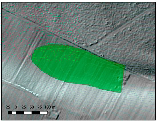 Example of a potential retention area in a DTM. The full polygon is colored green to better visualize the line arc of the relevant contour line (cyan). The background shows a shaded relief map.