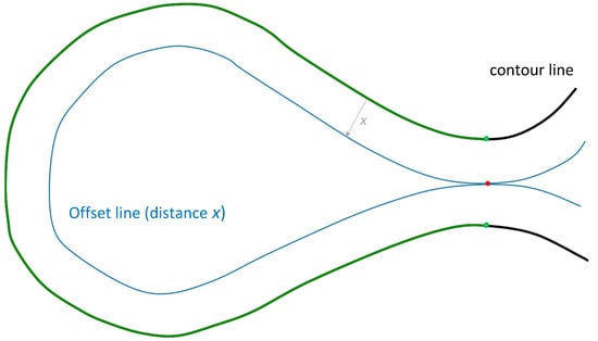 Thus, the basic idea of the algorithm is to search for these kinds of favorable segments along each contour line. This is realized by applying a parallel shift to the original line and identifying self-intersection points along the offset line. Assuming a parallel shift of a distance x, every point where two line segments of the shifted line touch or intersect indicates a location at which the contour line can be closed by a dam building of length 2x or shorter in case of intersection (c.f., Figure 2). As a second criterion, the contour line arc length has to be larger than a certain minimum in order to possibly enclose a sufficiently large area.