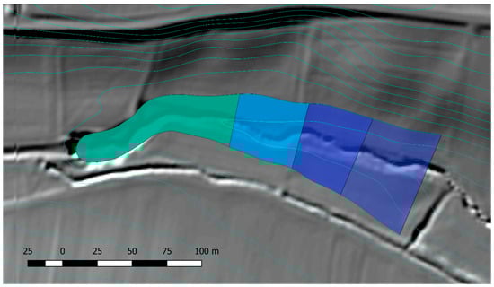 Each line arc corresponding to a valid detection defines a separate search section for the lower dam length steps, all other parts of the contour line are skipped. Once no valid detection is possible on a step, the following smaller steps—meaning shorter dams—are skipped (c.f., Section 2.2). For each of these polygon groups within one search section, the n best ones according to a simplified quality measure Q1 are kept. Assuming a similar mean depth for all polygons in one group, the area (Ar) can be used instead of the volume therefore ensuring faster processing. The respective simplified quality measure is provided in Equation 1. It relates the retention area to the dam extents, width wd and maximum height hd, thus being dimensionless. Indices r and d stand for retention area and dam, respectively. For hd, the lowest elevation of the DTM along the course of the dam is relevant.