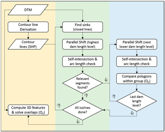 In the following section, the basic idea (Section 2.1) and the enhancement of dam length optimization (Section 2.2) are put in the context of the whole practical workflow from original DTMs to candidate retention area polygons. Figure 4 shows an overview of that workflow.
