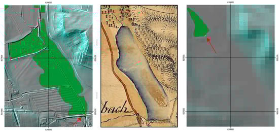 The very flat areas around a historic lake show obvious differences between the higher resolution model (left) and the low resolution model (right). In the latter one, the existing barrier at the south end is not represented thus not offering the possibility to close the retention area with a short dam (c.f., red arrows). A shaded DTM is overlaid with the contour lines (cyan), the detected polygons (green) and the dam buildings (orange). In the middle, a historic map (18th century) of the lake as provided by mapire.eu [] is shown.